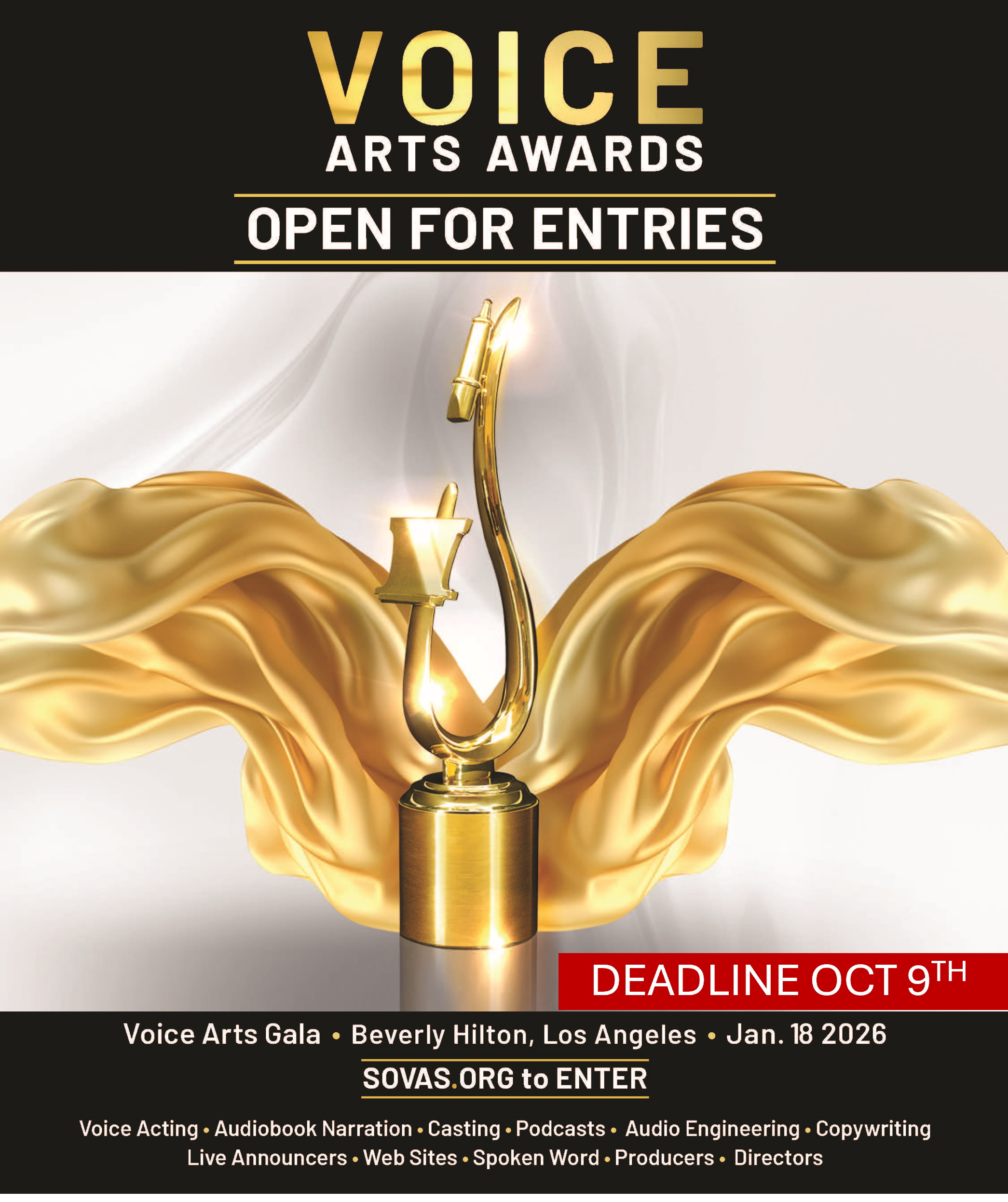 Step into the spotlight and share your voice with a global audience. With over 120 categories spanning multiple languages in nearly every genre of voice acting, the Voice Arts® Awards offers unparalleled opportunities for talent at every stage of the journey.