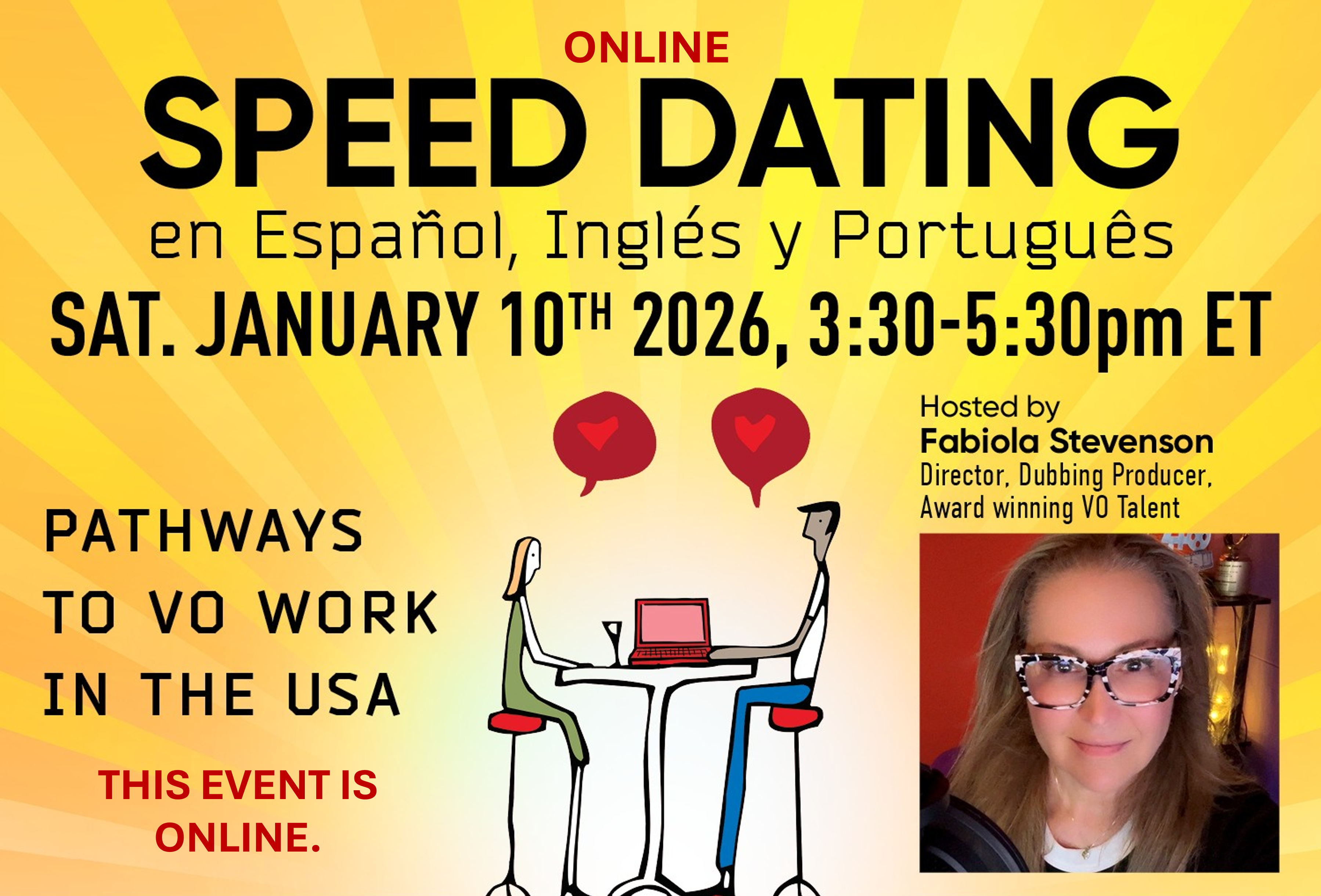 Up to 35 ticket holders of That’s Voiceover! Career Expo will be chosen to take part in this high-energy, career-changing experience. This edition is designed for Spanish and Portuguese-speaking voice actors who are bilingual in English. Accents are welcome, but you must be ready to work in English. The goal is to spotlight talented professionals for representation and employment opportunities.