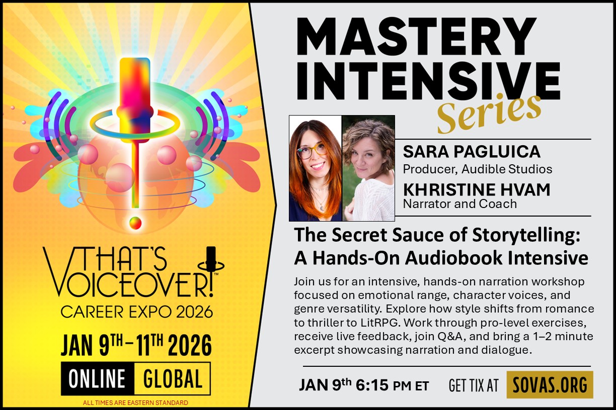 Mastery Intensive SeriesThat’s Voiceover!™ Career Expo proudly presents the Mastery Intensive Series (MI Series), the ultimate training experience for voice actors who refuse to settle for surface-level learning. Created for those ready to push past comfort zones and achieve real artistic breakthroughs, the MI Series brings together some of the most respected professionals in the industry for powerful, hands-on workshops that redefine what voiceover training can be. Each 2-hour session offers 12 active participant seats, where students receive one-on-one direction and targeted feedback designed to spark immediate growth. An unlimited number of auditors are also welcome to join and experience every moment of discovery by observing their peers challenged, guided, and transformed in real time. Participation is open to everyone, whether or not you hold a That’s Voiceover!™ ticket. For just $99, you’ll gain access to an intimate, semi-private environment where you can zero in on your craft, sharpen your instincts, and uncover what’s been holding you back. The MI Series is not for the casual observer. It is for those serious about mastery, the kind that turns auditions into bookings and talent into legacy. Don’t just attend That’s Voiceover!™. Experience it. Live it. Break through.