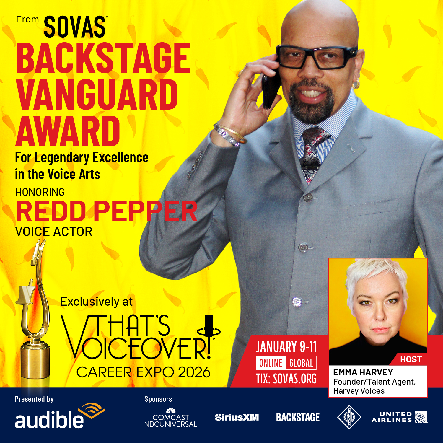 Prepare to be blown away. Announcing the 11th Annual Backstage Vanguard Award Honoree: Redd Pepper, legendary voice actor and our first-ever recipient from the United Kingdom. Don’t miss this landmark event and a deep dive into Redd’s extraordinary global career. Plus, actionable insights on how Redd positioned himself for success and how you can too! Learn from the best and be inspired to take your own VO career higher. It's all going down, LIVE FROM THE UK, online at That's Voiceover!™ Career Expo,